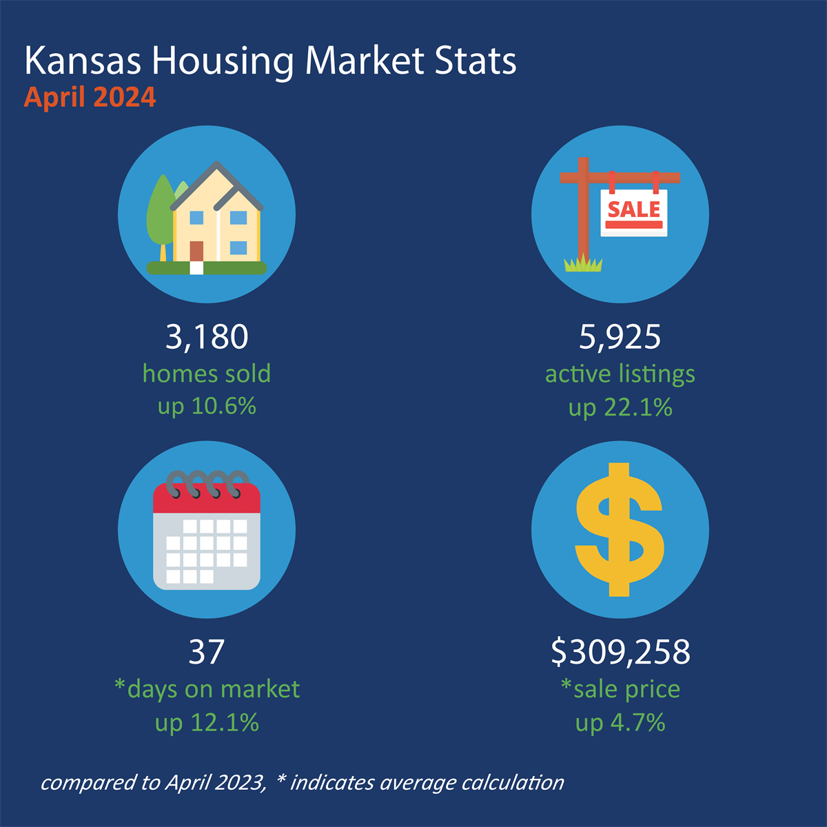 • Home sales in Kansas rose by 10.6% in April 2024 compared to the same period last year. National sales fell with sales falling 1.9% over 2023.
