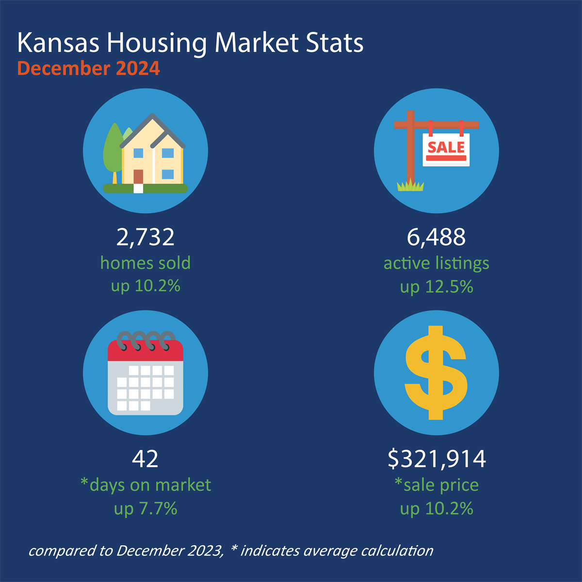 • Home sales in Kansas rose 10.2% in December 2024 compared to the same period last year. National sales rose with sales rising 9.3% over 2023.
