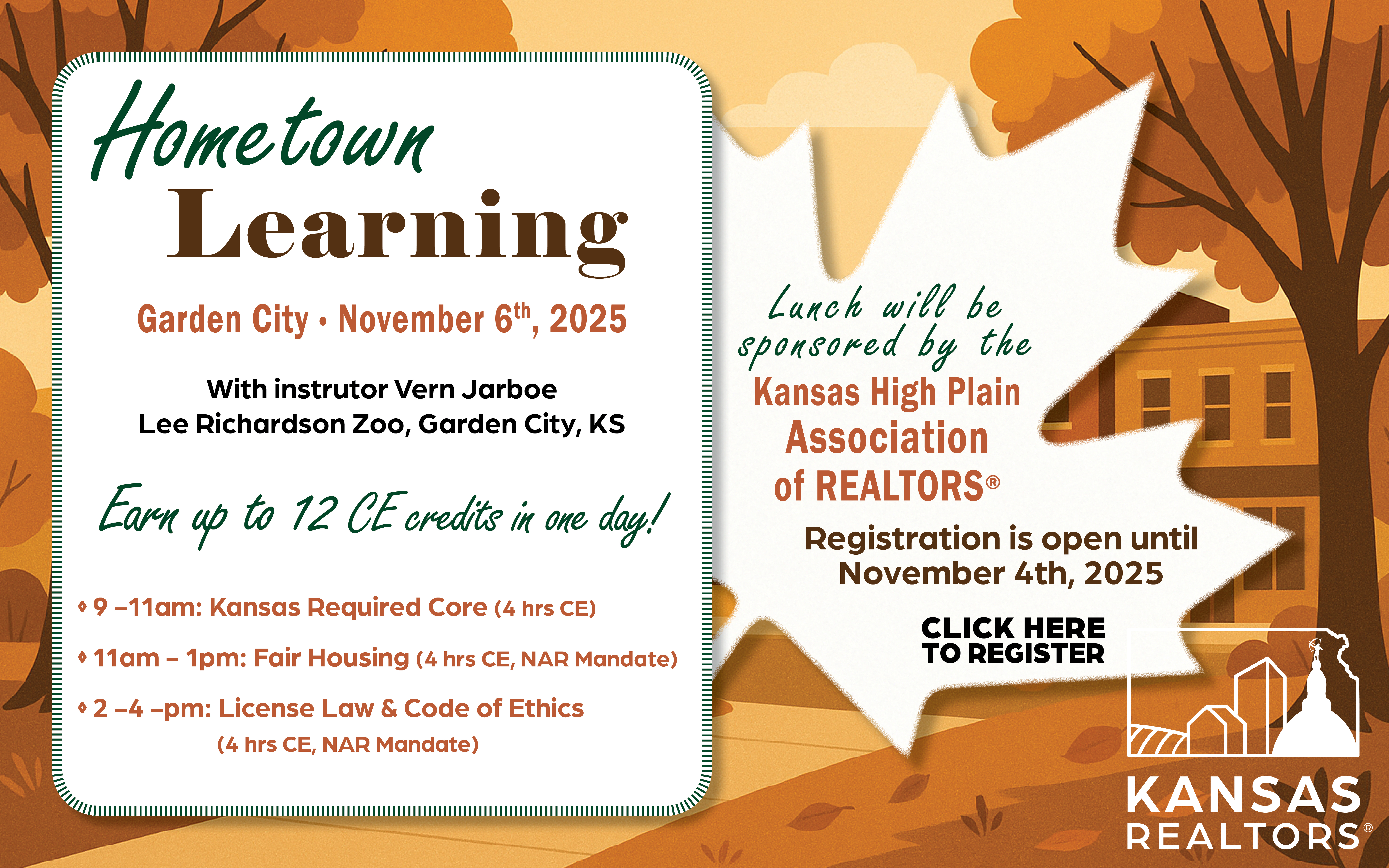The Hometown Learning program brings CE opportunities directly to communities across Kansas. If your area would like to host an upcoming event, email Ana at ana@kansasrealtor.com to learn how to bring Hometown Learning to your local association.